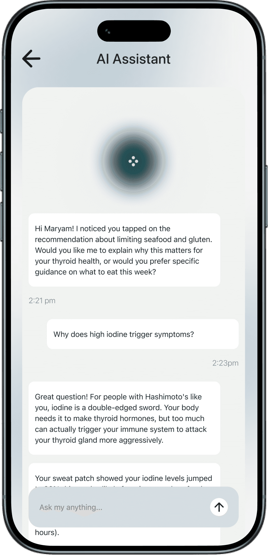 The Vitara app serves as the central hub, synthesizing data from the iodine patch and smart ring to build a digital twin of the user's thyroid function. Using AI-powered analysis, it detects patterns between iodine levels, physiological indicators, and symptom flares. The app provides personalized recommendations for diet, medication timing, and lifestyle adjustments—enabling users to manage their condition proactively between doctor visits and maintain optimal thyroid health.